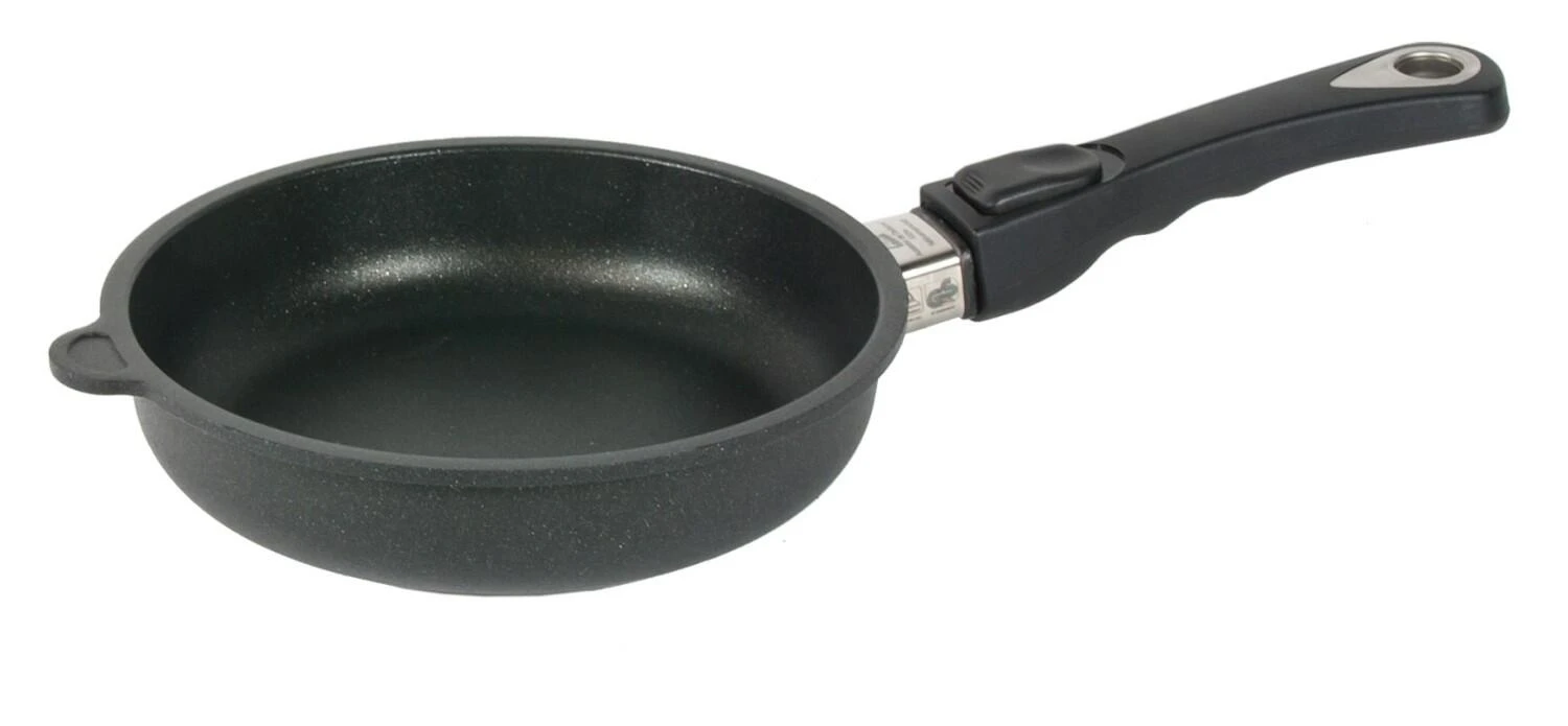 AMT Bratpfanne mittelhoch mit abnehmbarem Stiel. Besonders platzsparendes Aufbewahren und zum Überbacken im Ofen geeignet.