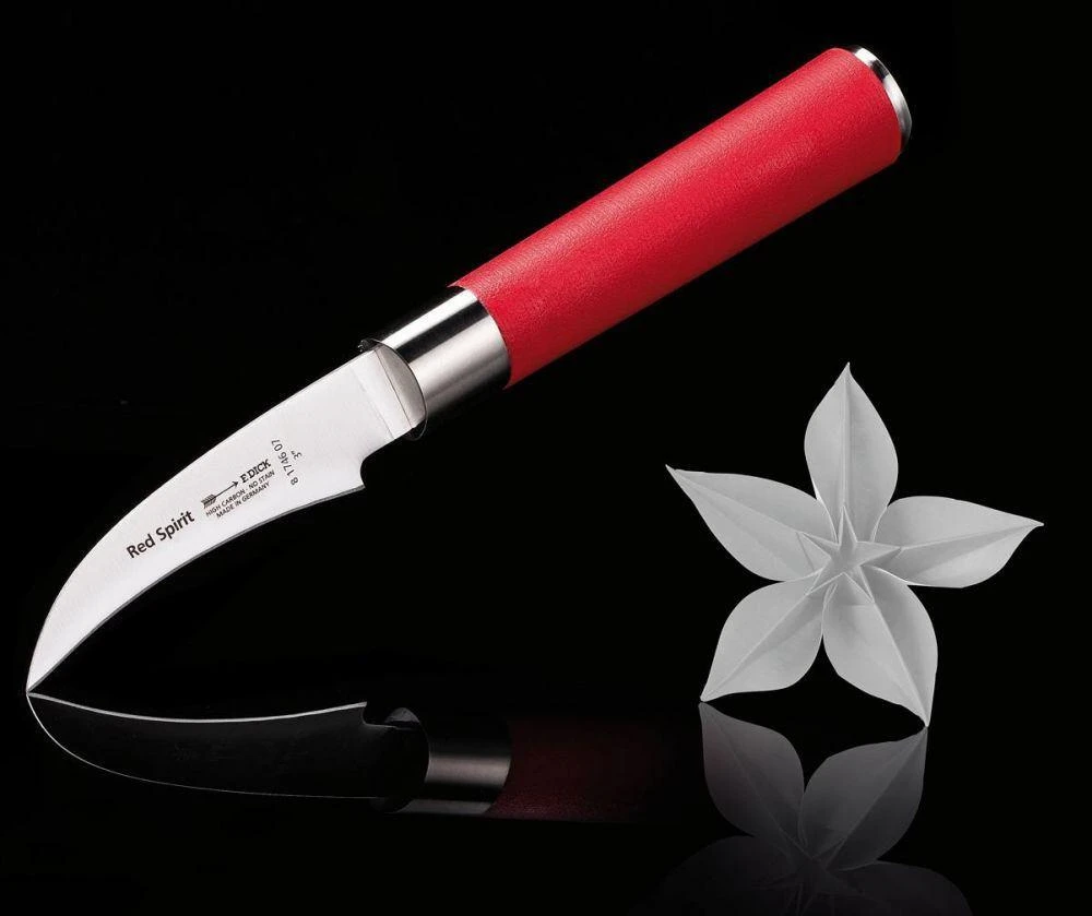 Dick Tourniermesser aus der Serie Red Spirit. Schälen, schneiden und anrichten mit dem Tourniermesser mit geschwungener Klinge.