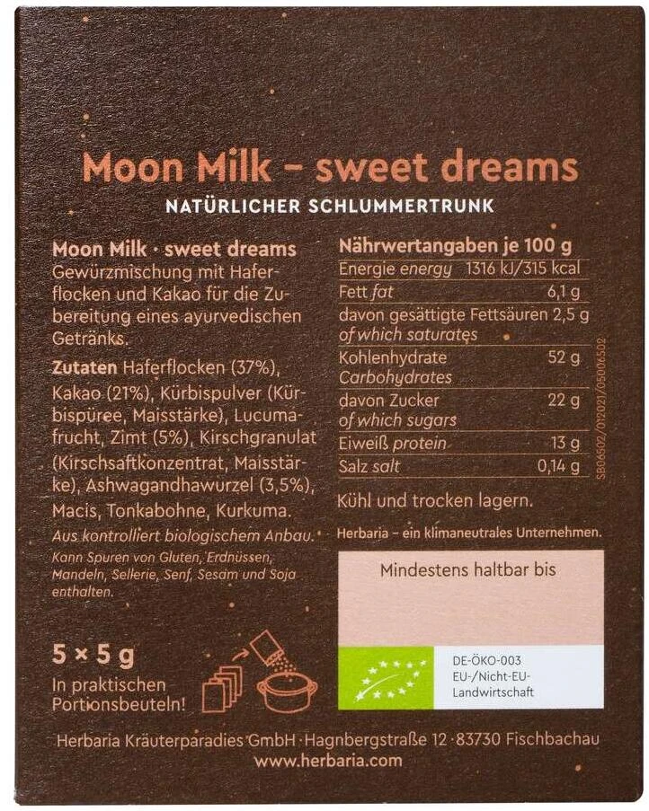 Herbaria Moon Milk Sweet Dreams, Bio-Gewürzmischung. Gewürzmischung für Milch, Haferdrink oder einen anderen Pflanzendrink. Der Schlummertrunk schlechthin!