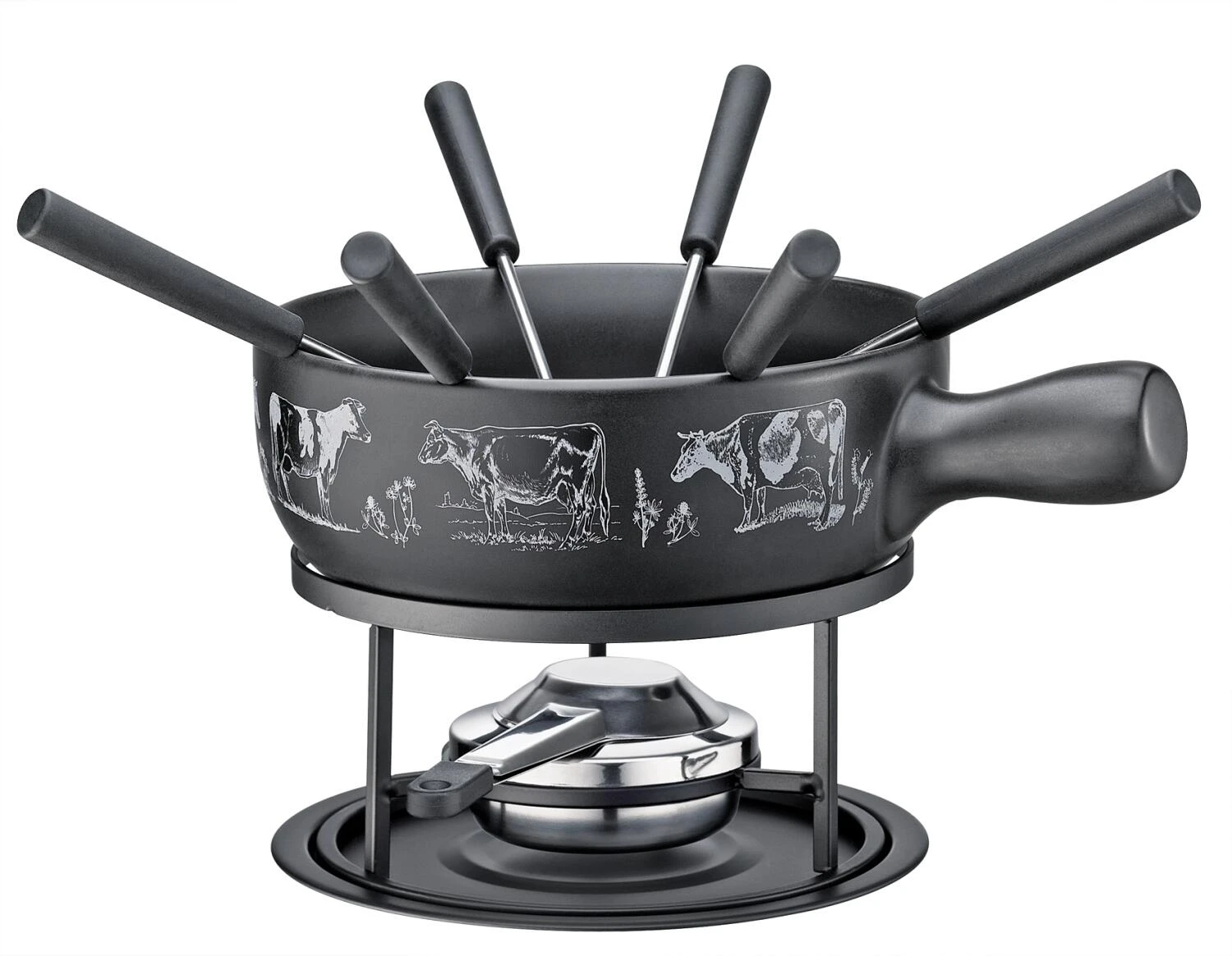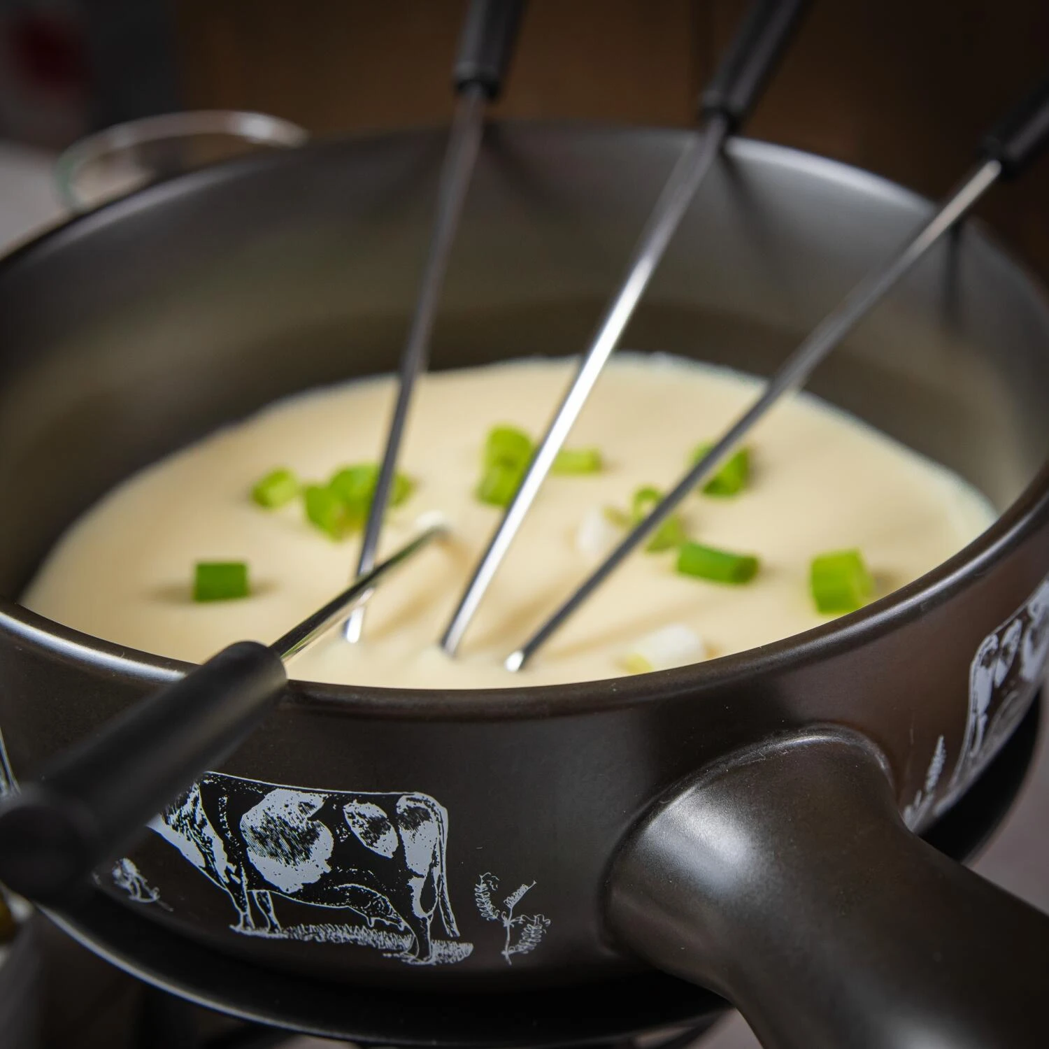 Ob als Klassiker zum Silvestermenü oder zu anderen Feierlichkeiten im Jahr: Ein Käsefondue verleiht dem Abend einen besonderen Glanz. Das Caquelon des Sets ist aus feuerfester Keramik und für alle Herdarten, außer Induktion, geeignet. Das standfeste Rechaud mit Untersatz und Pastenbrenner ergänzt das Set.