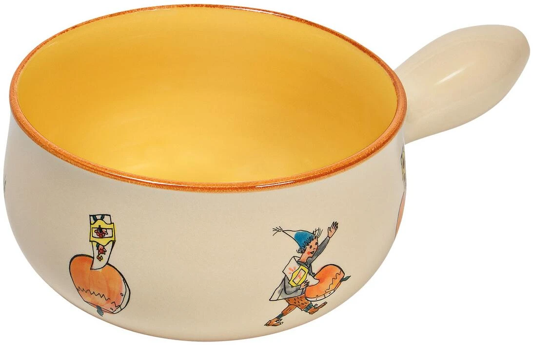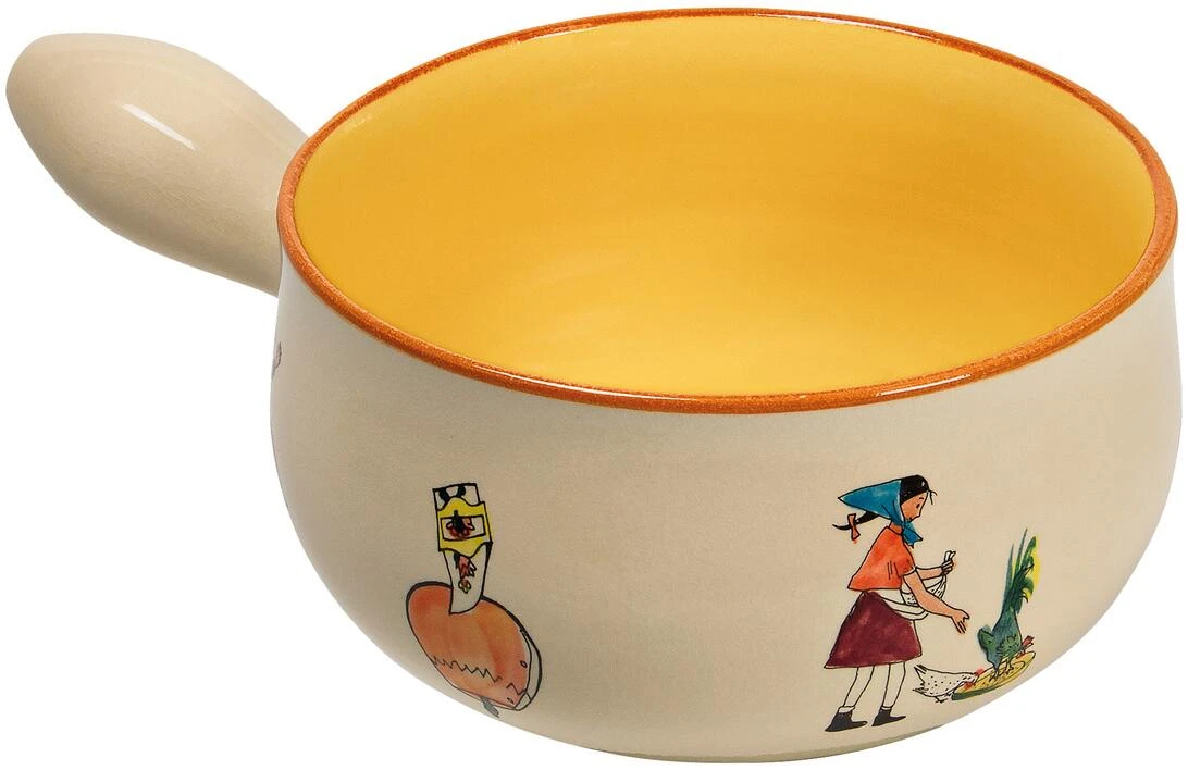 Jedes Caquelon ist ein Unikat und wird nach den Zeichnungen des berühmten Schweizer Malers Alois Carigiet in der Schweiz von Hand bemalt.