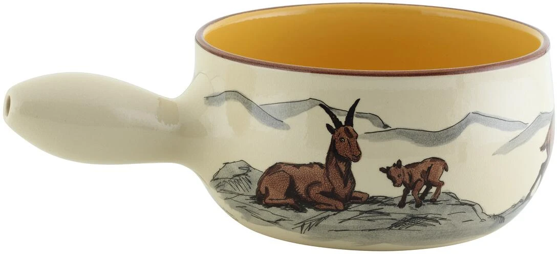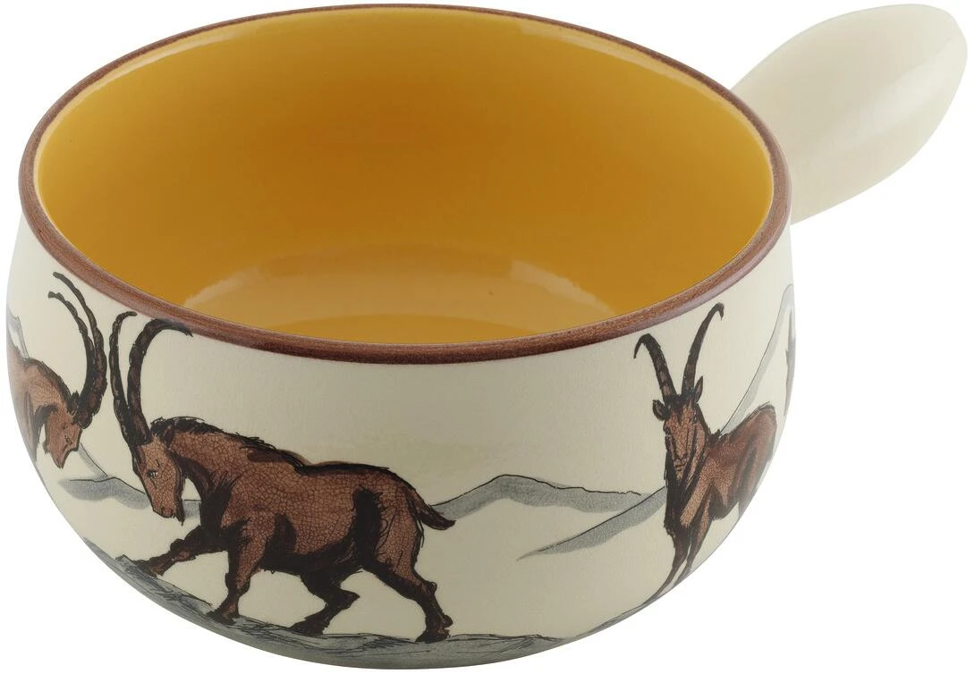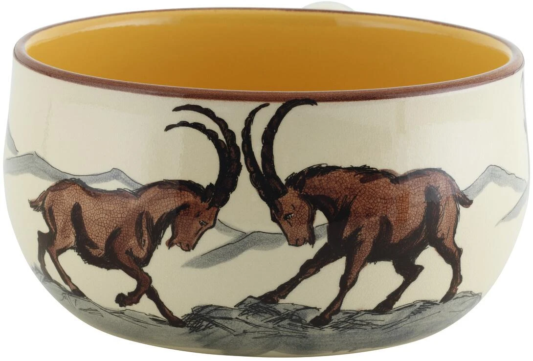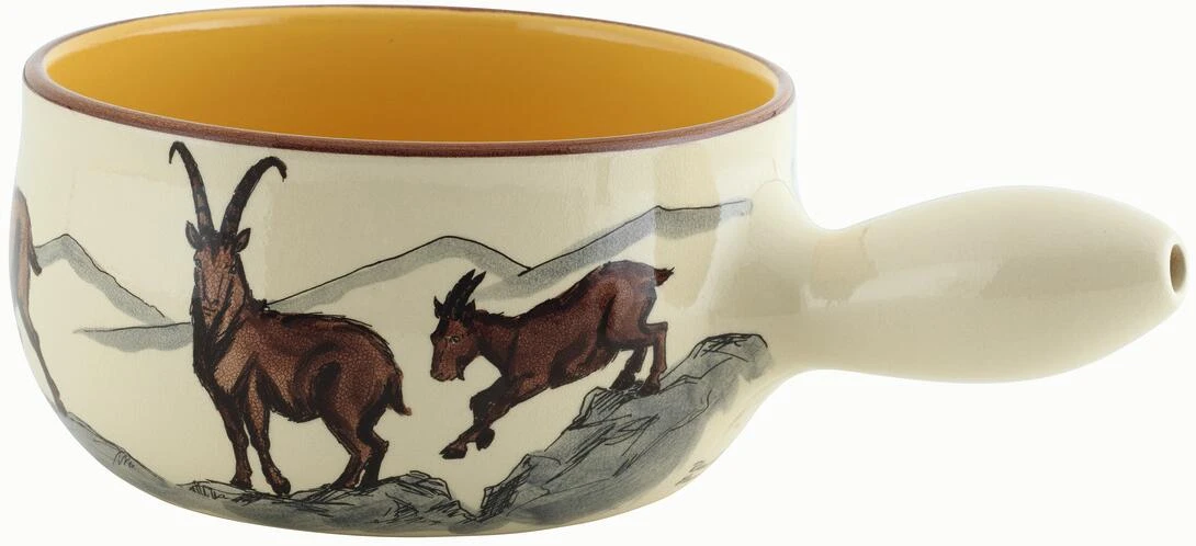 “König der Berge” wird der Steinbock gerne genannt. Das beliebte Schweizer Wildtier mit seinen imposanten Hörnern wurde mit dem Bergsujet-Dekor von unseren Keramikmalern neu interpretiert. Die helle Glasur im Eierschalenton verleiht dem Geschirr eine moderne Optik in zeitlosem Design. Neuheit für dieses Jahr: Caquelon 20 cm, Mug 2.8 dl, Teller 21cm.