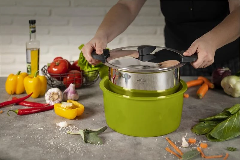 Ökologisches und gesundes Essen in einem: Mit dem Hotplan Servierkochtopf von Kuhn Rikon werden Gerichte in Minutenschnelle zubereitet und gleichzeitig bis zu 60% weniger Energie verbraucht. Gleichzeitig können die zubereiteten Speisen für zwei Stunden heiss gehalten werden.