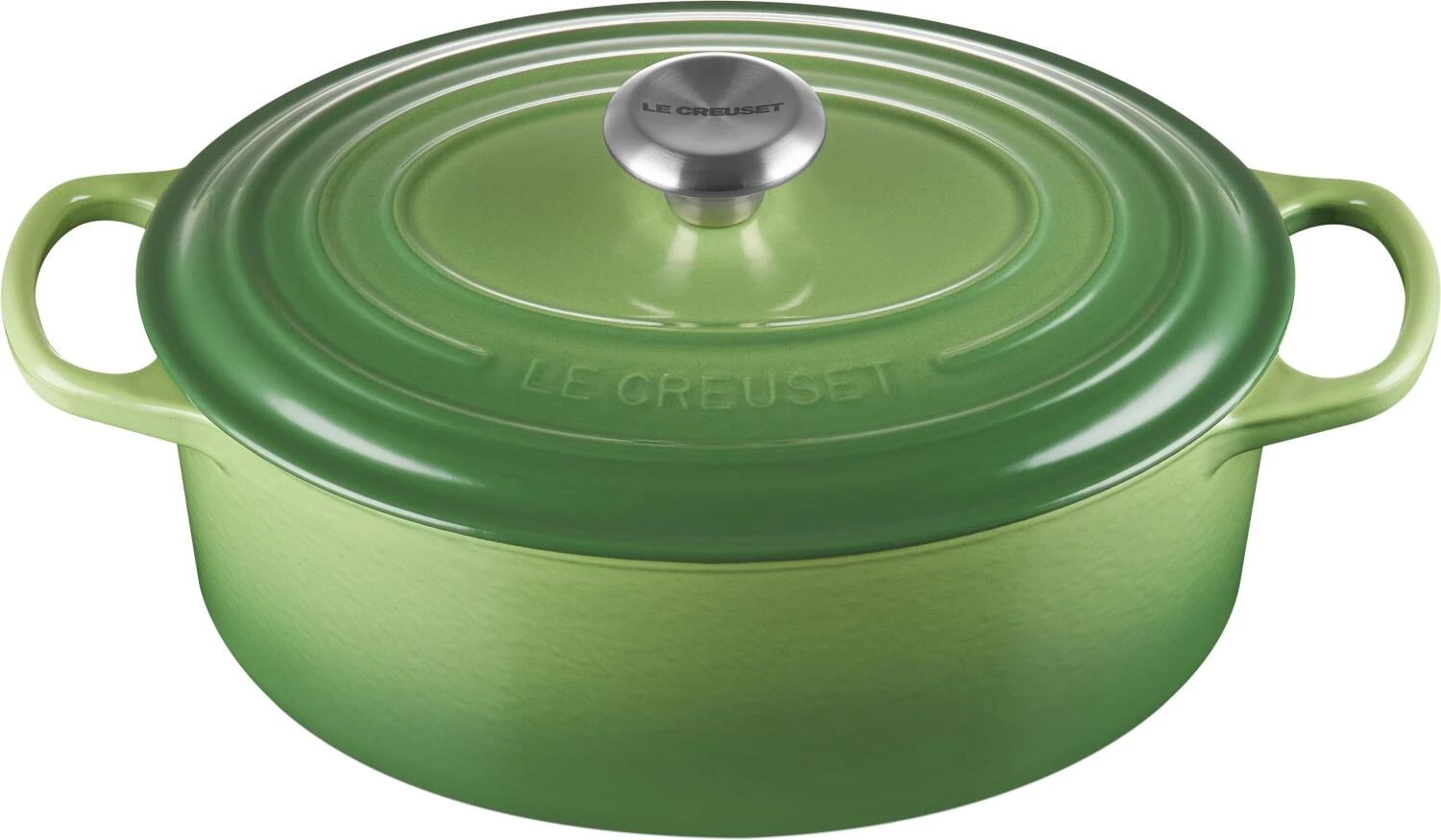 Le Creuset Bräter SIGNATURE oval in Bamboo Green. Ideal für größere Braten und Geflügel am Stück. In den ovalen Bräter in 40 cm passt sogar eine ganze Gans, weshalb er auch „Gänsebräter“ genannt wird.
