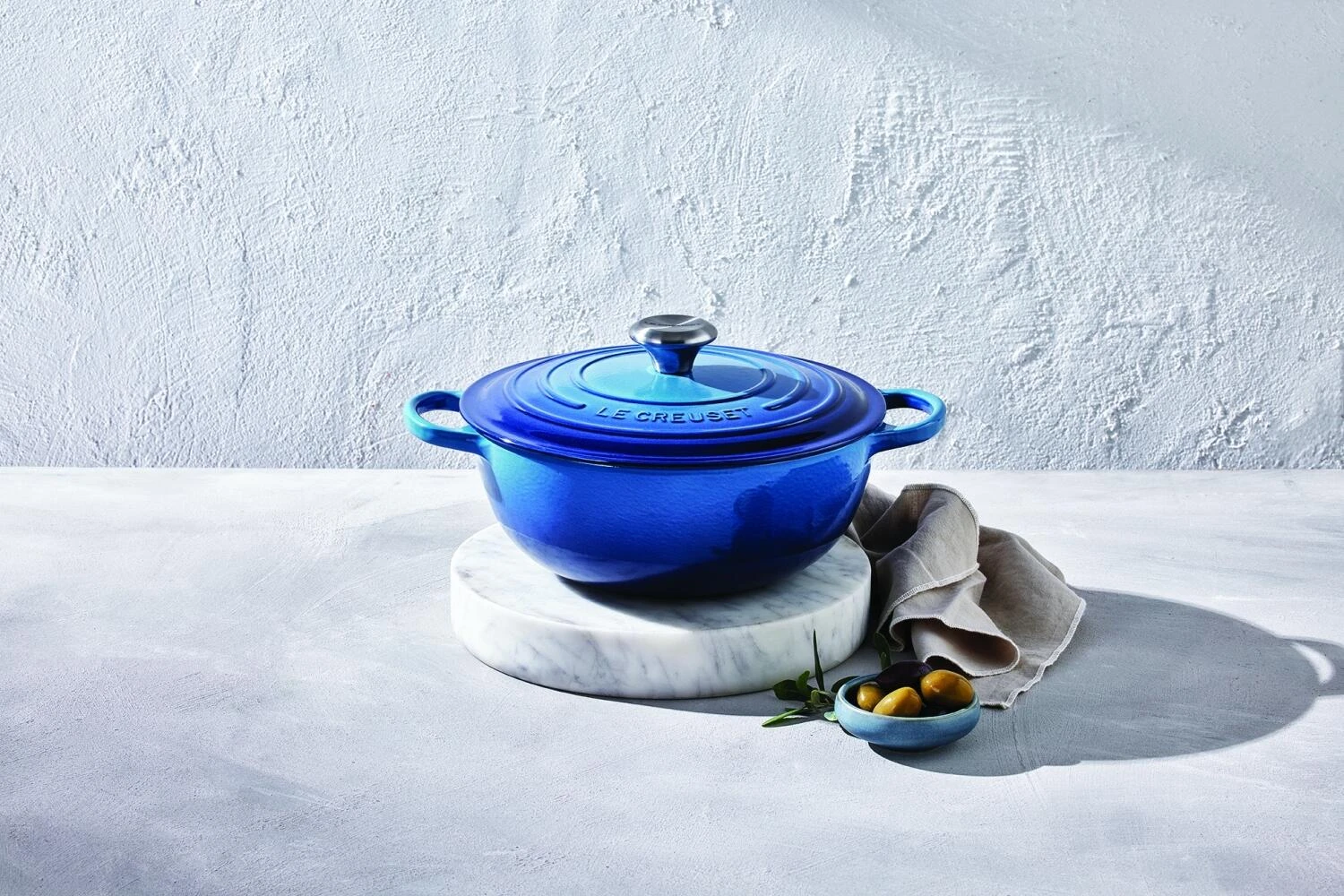 Ein leuchtendes Blau, Azure: Ein strahlender Himmel und das weite Meer, das von hell in dunkel übergeht. Die neueste Farbe Azure von Le Creuset kitzelt das Urlaubsgefühl heraus und holt den Sommer, die Leichtigkeit und das Speisen unter klarem Himmel bei einer frischen Meeresbrise nach Hause. Ruhe und Entspannung stellen sich ein und bringen Wohlfühlatmosphäre in die eigenen vier Wände. Der deutlich ausgeprägte, klare und kräftige Farbverlauf ist eine angenehme Ergänzung der Farbpalette von Le Creuset und passt sich den weiteren Blautönen nahtlos an. Die Farbreihe azure schmückt jeden Tisch mit Anmut und kultivierter Schönheit.