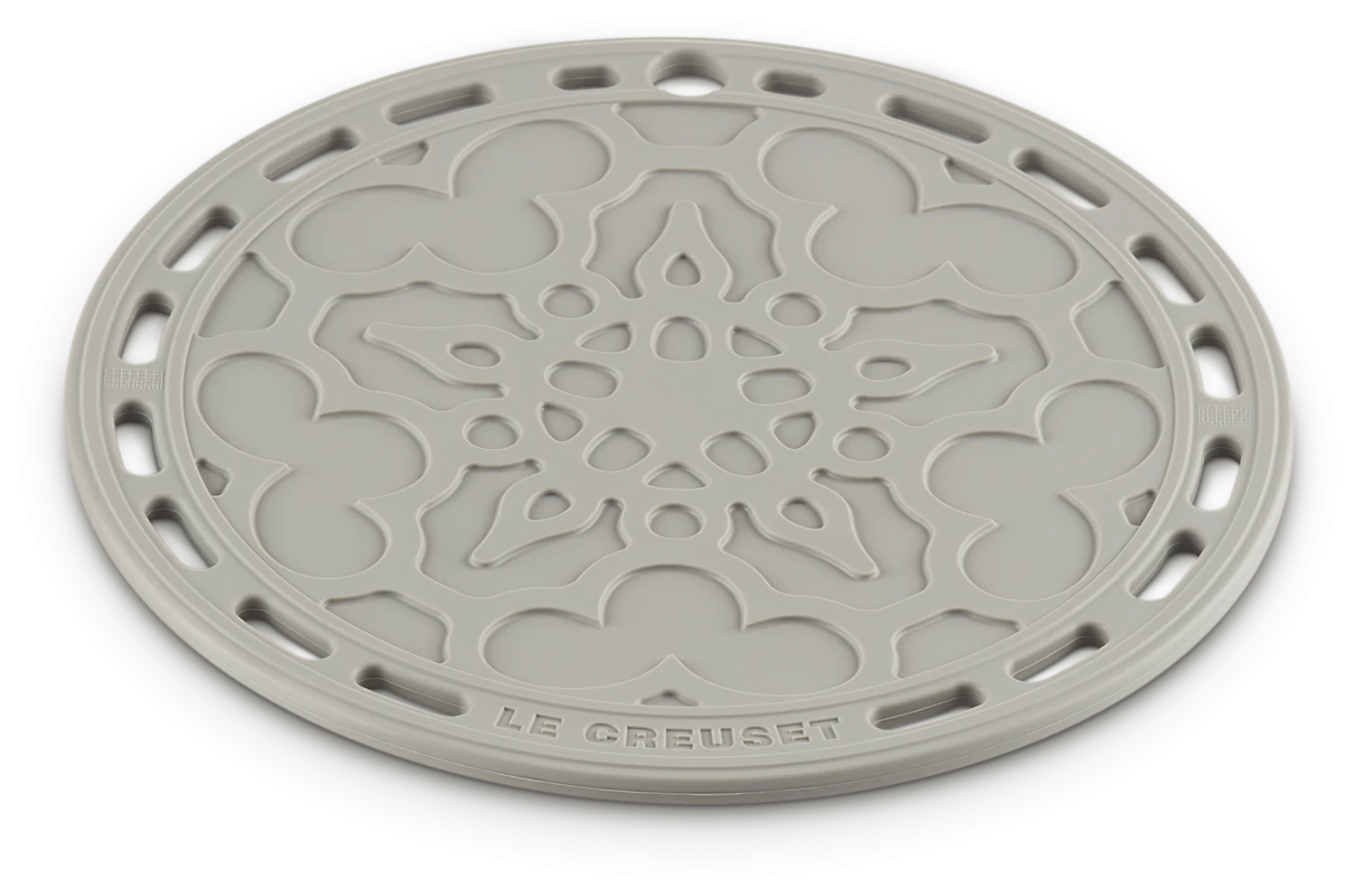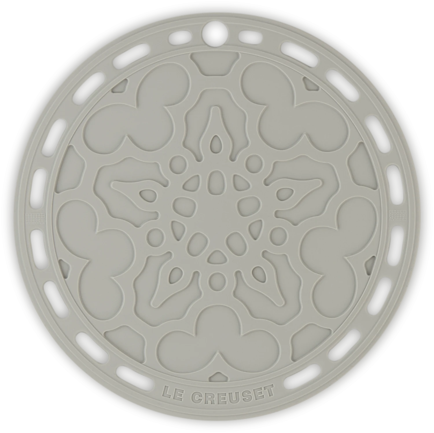 Le Creuset Silikonuntersetzer Tradition in perlgrau. Praktischer Küchenhelfer aus Silikon und verstärktem Nylon, bis zu 250 °C hitzebeständig.