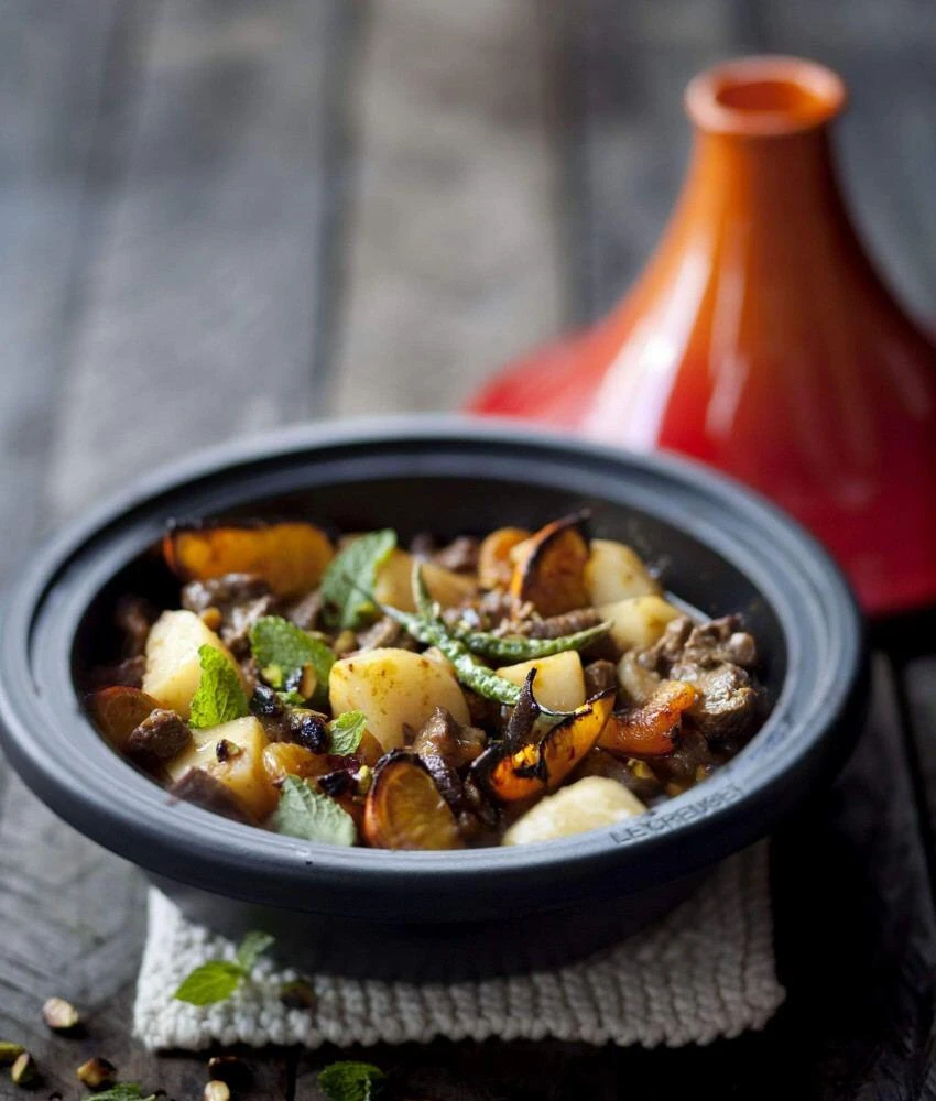 Le Creuset Tagine in meringue. Die Tagine ist nicht nur das ideale Kochgefäß für das typisch nordafrikanische Schmorgericht – sie kann noch viel mehr! Freuen Sie sich auf Schmorgerichte voller Geschmack und Nährstoffe, denn sie lassen sich in einer Tagine besonders schonend zubereiten.