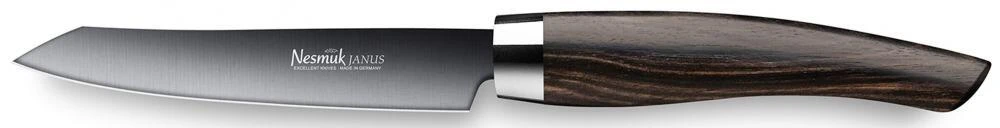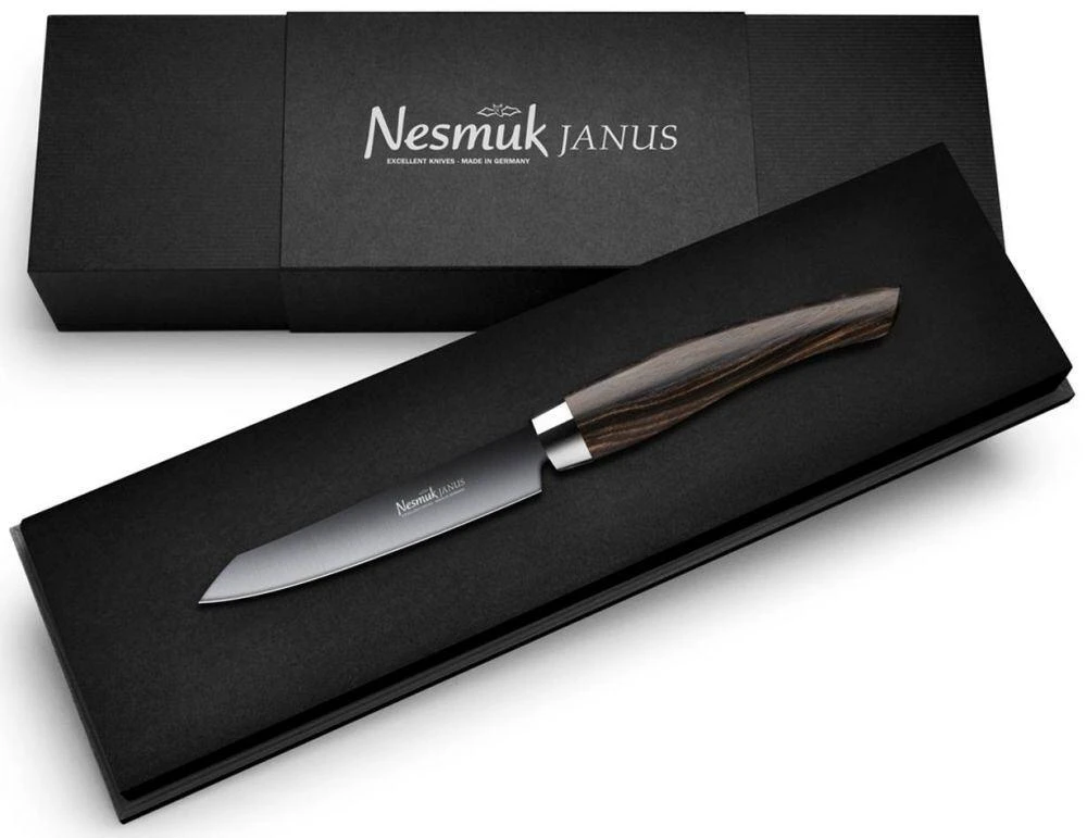Dieses Officemesser aus der Serie Janus verbindet das handwerkliche Können und die langjährigen Erfahrungen von Nesmuk mit modernsten Materialien und Fertigungsmethoden. Die hochwertige DLC-Beschichtung zeichnet sich durch enorme Härte (2.300 Vickers), niedrige Reibwerte und hohe Haftfestigkeit aus. Die Klinge aus rostbeständigem Hochleistungsstahl mit Niobanteil und Klingenhärte von 60 HRC, der im Klingenstahl trotz Rostfreiheit, Säure- und Kratzunempfindlichkeit für ein sehr feines Gefüge sorgt, ermöglicht eine lange Schneidhaltigkeit. Die massive Messerzwinge aus gebürstetem matten Edelstahl und der formschönen Griffe aus Edelholz unterstreichen die handwerkliche Qualität. Die kurze Klinge des Officemesser Janus von Nesmuk ist perfekt zur Vor- und Zubereitung, Putzen oder zum Schälen von z.B. Obst und Gemüse geeignet. Geliefert wird das Messer in einer hochwertigen mattschwarzen Schatulle und ist die perfekte Wahl für Vor- und Zubereitungsarbeiten.