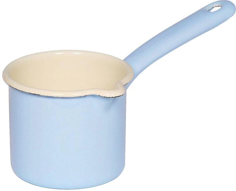 Riess Schnabeltopf mit Stiel aus Emaille in pastell-blau. Der kleine Topf mit Stiel, Bördelrand und Ausguss ist für alle Herdarten inklusive Induktion und Gas sowie für offenes Feuer geeignet.