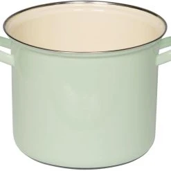 Riess Topf aus Emaille in nilgrün. Der hohe Kochtopf mit 22 cm Durchmesser ist für alle Herdarten sowie offenes Feuer geeignet. Das besondere Material mit robusten Chromrand ist schnitt- und kratzfest und leicht zu reinigen. Emaille ist von Natur aus bakterienhemmend und aromaneutral.