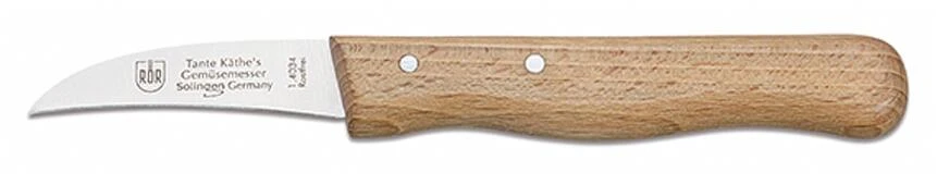 RÖR Schälmesser Tante Käthe mit Buchenholzgriff und gebogener Klinge.