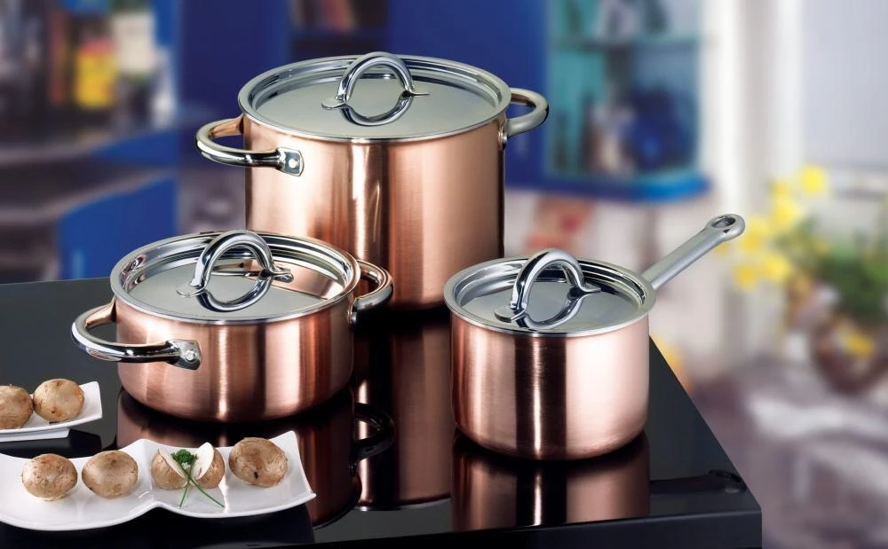 - hochwertiges 3-Schicht-Material aus Kupfer, Aluminium, rostfreiem Edelstahl 18/10 in schwerer Ausführung
