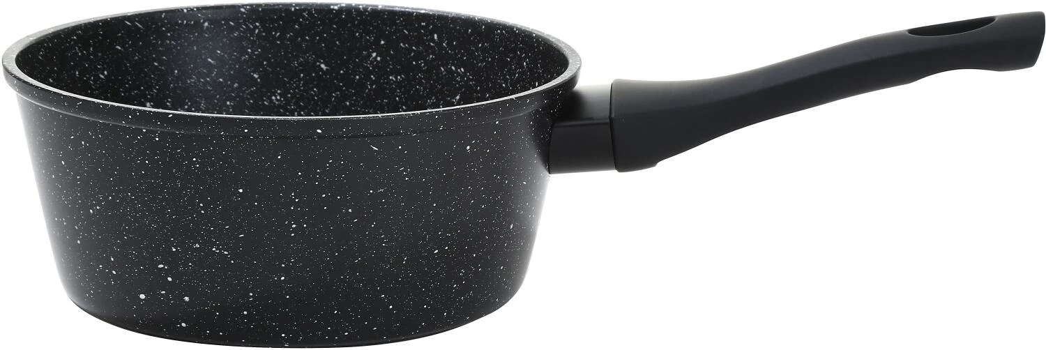Der Soft-Touch-Griff liegt besonders angenehm in der Hand. Durch die Antihaftbeschichtung läßt sich der Stieltopf leicht reinigen, auch in der Spülmaschine. Dier Topf ist induktionsgeeignet. Der Stone-Look mit weißen Sprenkeln auf schwarzem Grund sorgt innen wie außen für ein modernes Aussehen.