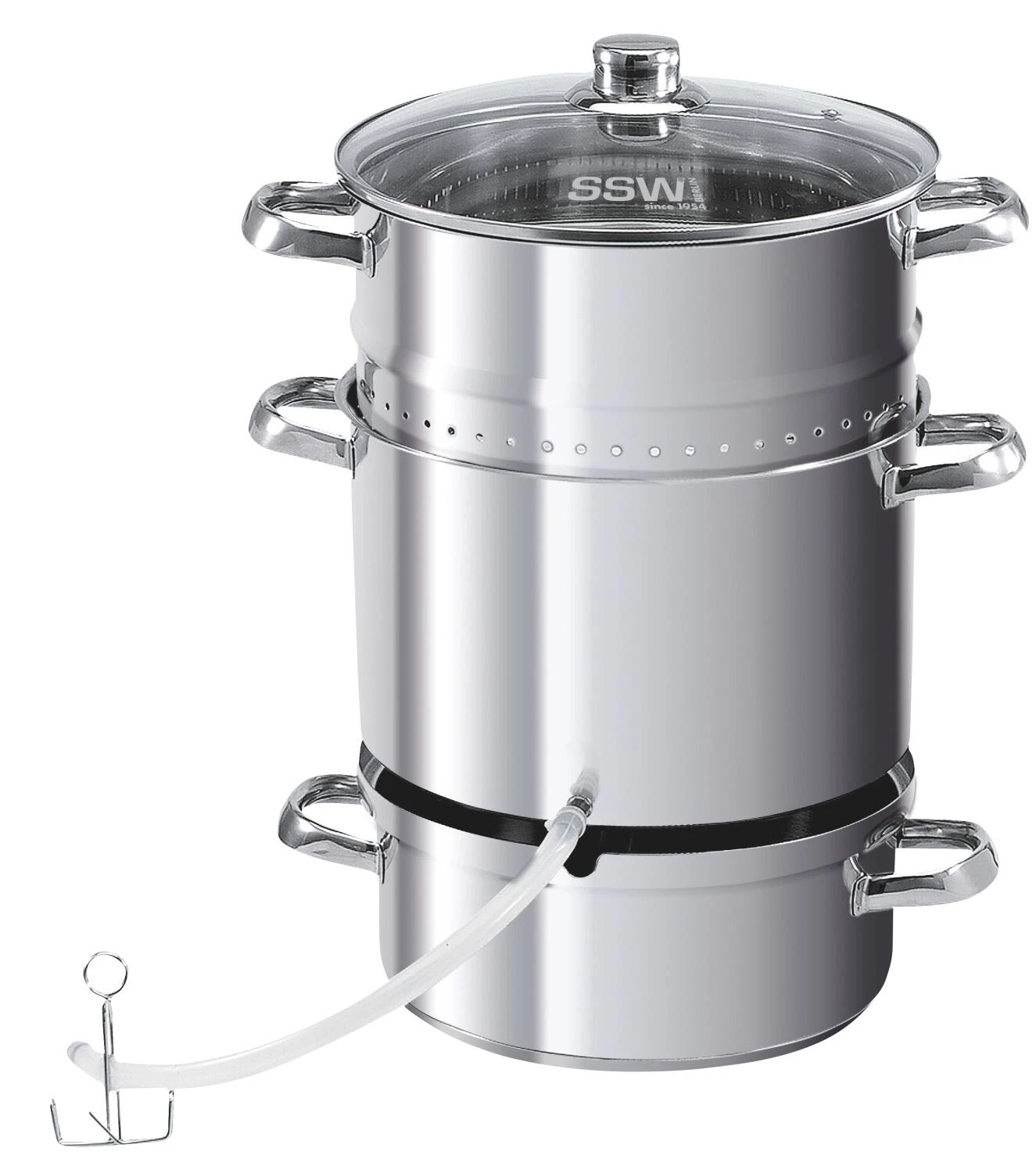 Der Dampfentsafter Loop von SSW ist ein Muss für alle, die Obst- und Gemüsesäfte lieben. Mit dem Topf und seinen 16,5 L Fassungsvermögen lassen sich leicht mittelgroße Mengen an Obst und Gemüse verarbeiten. Durch die Dampfgarmethode bleiben die wertvollen Vitamine erhalten und die Saftausbeute ist hoch. Der Entsafter besteht aus einem Topf, Obst- und Entsaftungsaufsatz sowie Zubehör.