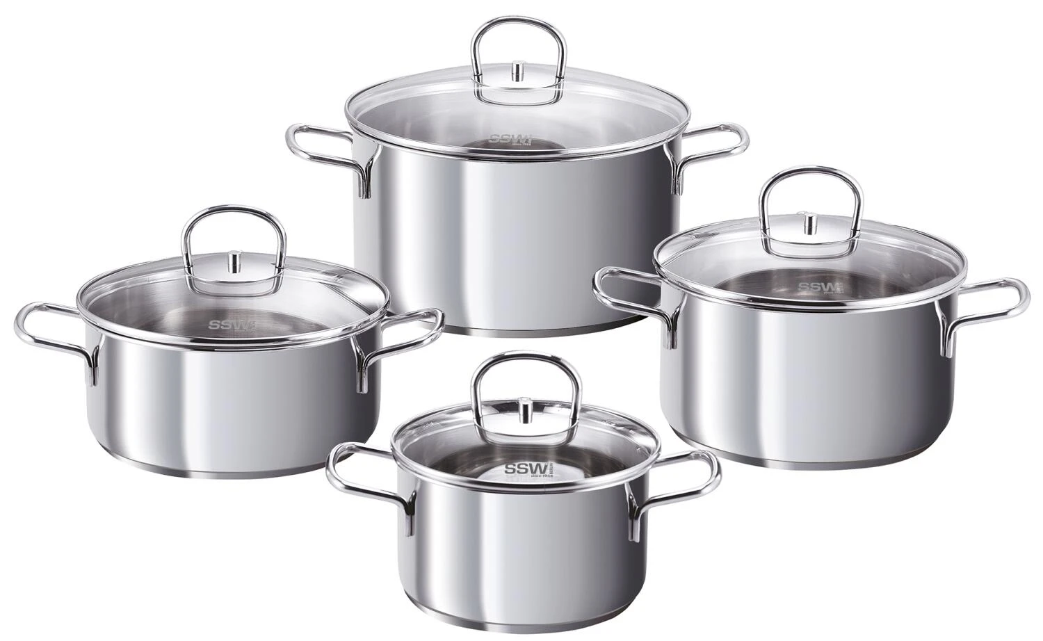 SSW Topfset Avocado, 4-tlg. Vier Edelstahltöpfe mit jeweils dazugehörigem Glasdeckel.