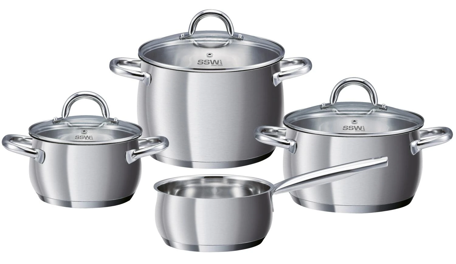 SSW Topfset Lollo Rosso, 4-teilig mit Kochtopf und Glasdeckel (Ø 16, 20 und 22 cm) und Stielkasserolle (Ø 16 cm).