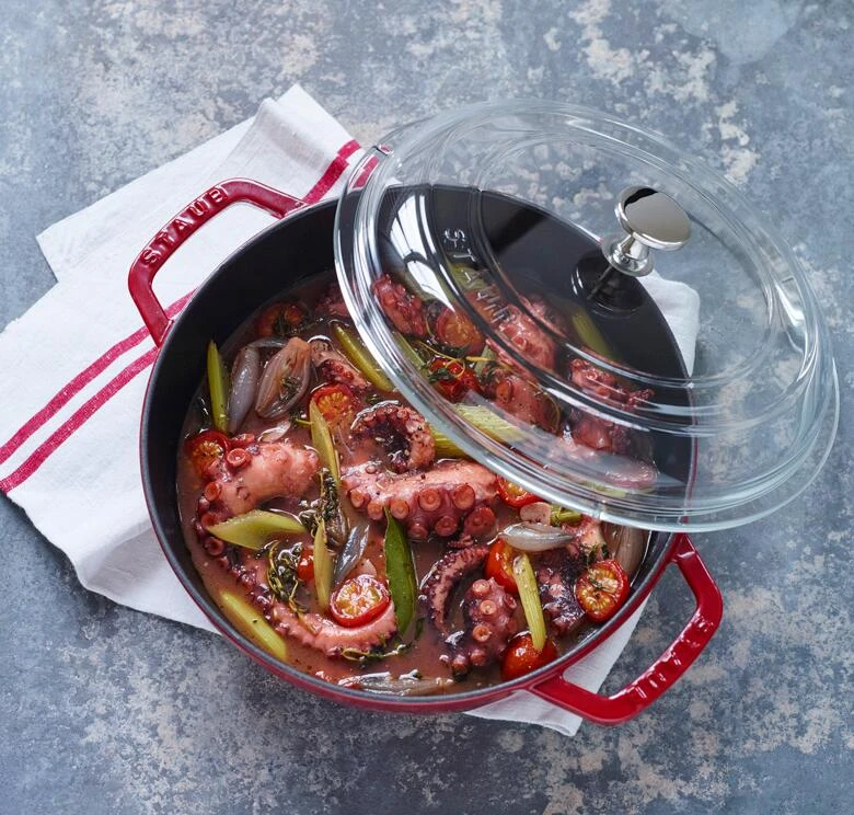 Der Bräter von Staub eignet sich gleichermaßen zum Braten und Schmoren und vereint die Vorteile von Gusseisen in einem. Da Gusseisen die Wärme speichert und gleichmäßig an die Gerichte weitergibt, ist ein schonenderes Garen auf niedrigster Stufe möglich. So erzielen Sie mit der Sauteuse besondere aromatische Geschmacksergebnisse von Fisch, Fleisch und Gämse.
