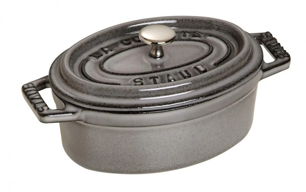 Staub Mini Cocotte oval aus Gusseisen in graphitgrau. Ideal zum Zubereiten und Servieren kleiner Schmor- und Backgerichte.