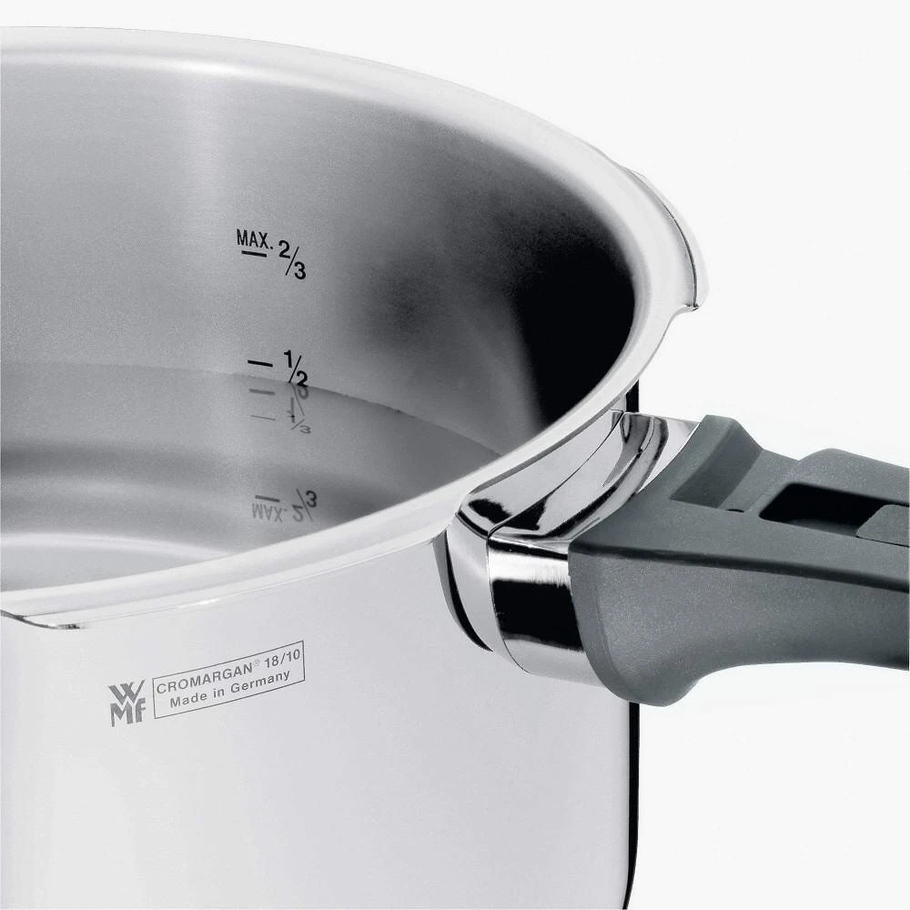Die WMF Schnellkochtopf –Serie “Perfect Plus” verbindet bewährte Technik mit modernem Design und ist das Fitnesscenter für kulinarische Genüsse. Braten, Schmoren, Dünsten oder Dämpfen geht – der WMF Perfect Plus schafft einfach alles! Die Ringe auf dem übersichtlichen Kochsignal zeigen zwei Garstufen. Eine Restdrucksicherung mit farbiger Anzeige sowie der Flammschutz für alle Topfgriffe zeichnen den Schnelltopf mit TransTherm®-Allherdboden aus. Zur Reinigung wird der Griff komplett abgenommen und unter fließendem Wasser abgespült. Der Topf ist mit einer Innenskalierung ausgestatte und induktionsgeeignet.