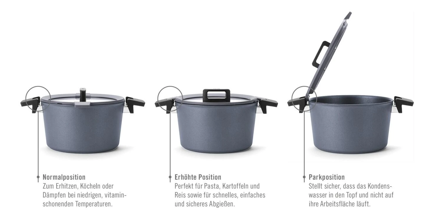 Der Deckel aus Glas mit Silikonrand bietet viele Einsatzmöglichkeiten: langsames Garen, Dämpfen, Ausgießen sowie bequemes Umrühren – dabei bleibt die Arbeitsfläche sauber.