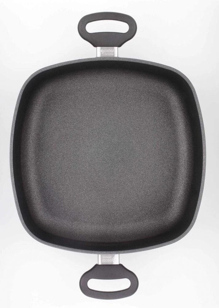 Für beste Kochergebnisse sorgen der ca. 8 mm starke Boden aus spannungsfreiem Aluminium-Kokillen-Guss und die dauerhaft beständige und schnittfeste Antihaftversiegelung aus Hightech-Titanium. Die Seitengriffe sind backofenfest bis 250 °C.